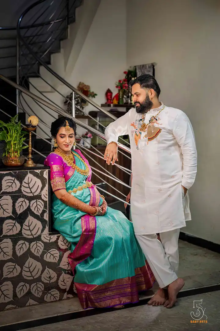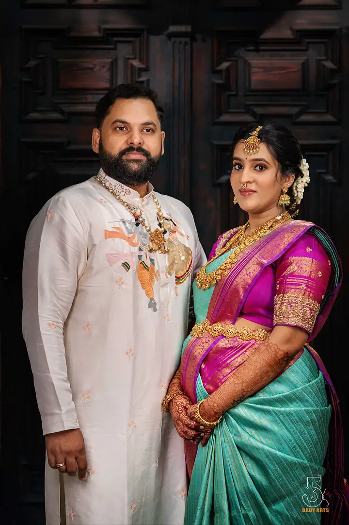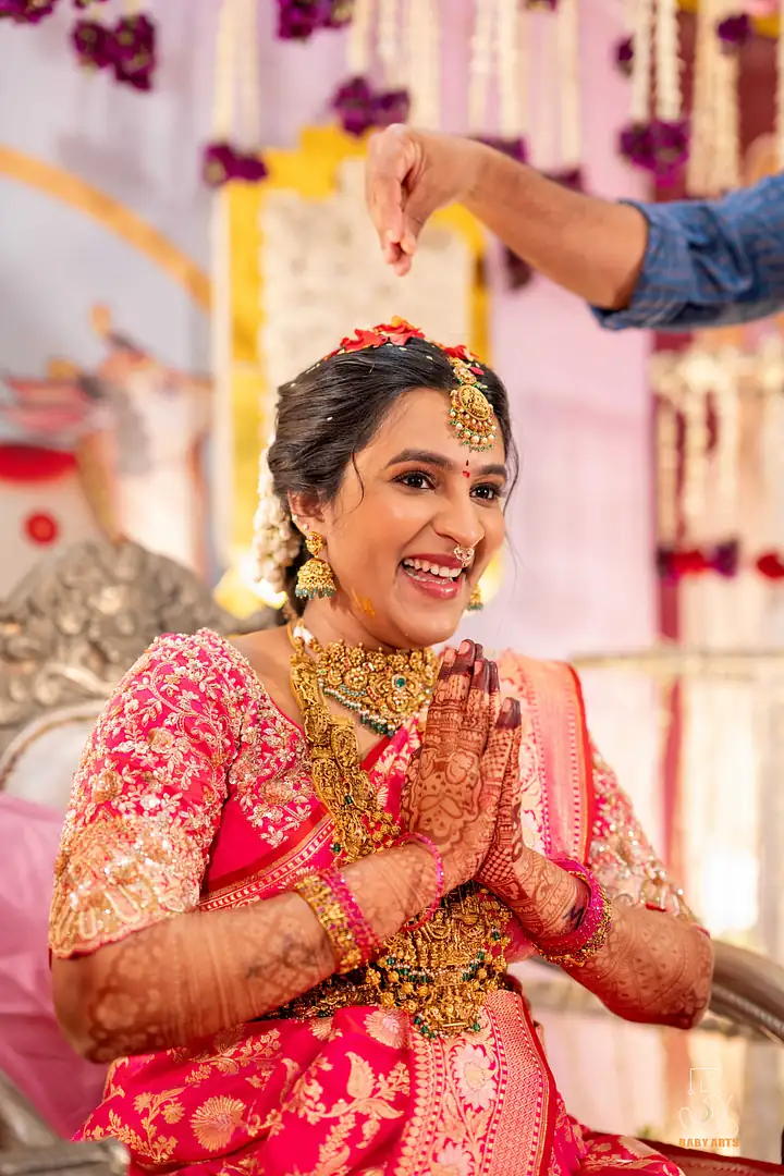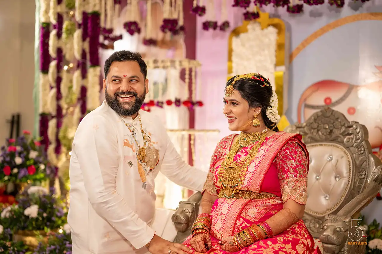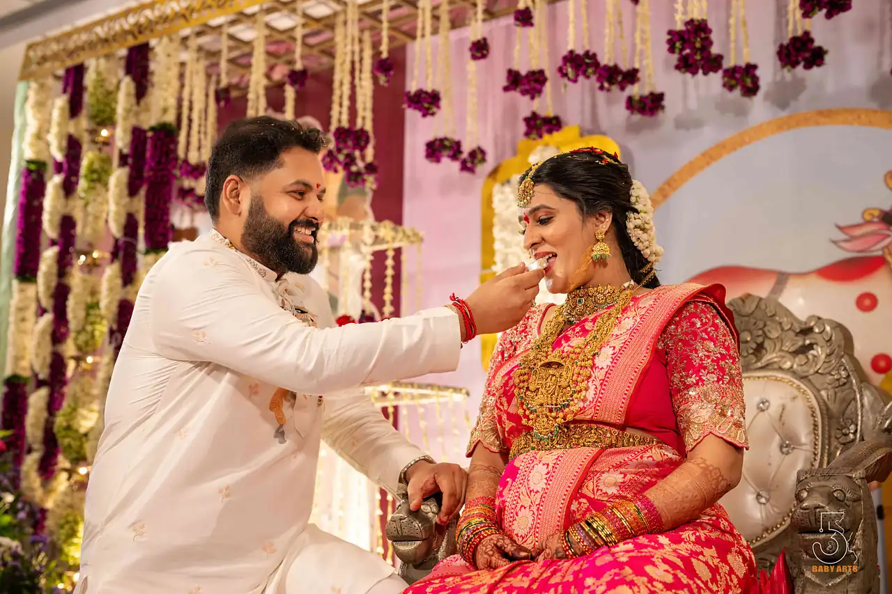 The ceremony of Manjari took place in the splendid Kshatriya Kalyana Mandapam, where the soft hues of the evening sky blended beautifully with the ornate decorations. Visakhapatnam provided a picturesque setting, with the venue’s grandeur adding a layer of elegance to the day. The atmosphere was charged with excitement, laughter, and anticipation as family and friends gathered to celebrate this significant occasion, each corner of the mandapam radiating warmth and joy.